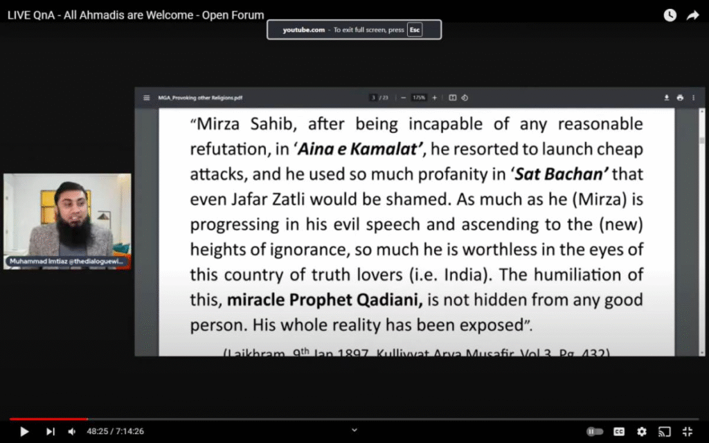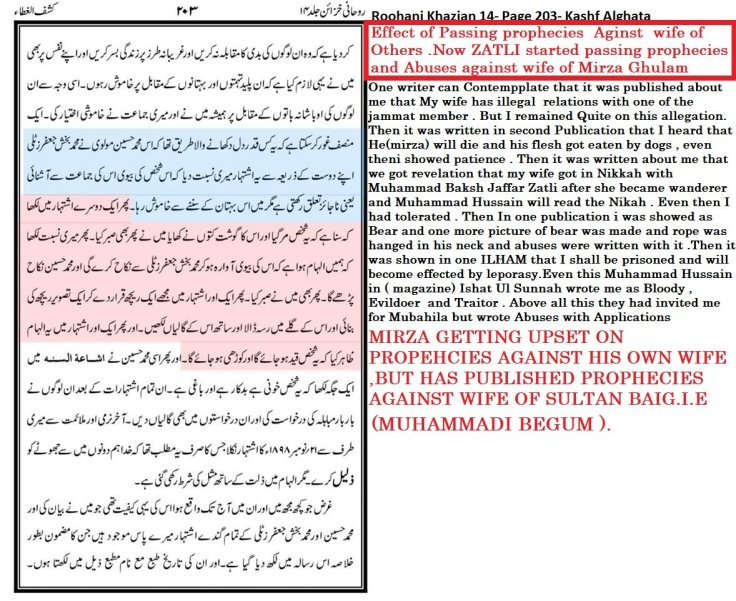 In 1898, in MGA’s english and Urdu book, Kashif ul Ghita (In english as, “The Truth Unveiled”(1898), he mentioned how a person named Mullah Muhammad Baksh of Lahore had written foul and indecent language about MGA’s wife in a magazine called Jafar Zatalli, MGA also mentioned this newspaper in “A Hidden Truth” (Raz-e-Haqiqat)(1898). Syed Muhammad Hussain Batalvi was also involved heavily in this as was a certain Abul Hassan Tibiti (as-in from Tibet)(see Mujadid e Azim, online english abridged version). Per Ahmadiyya sources, these ishtahar’s vs. MGA were published from June–1897 to Aug–1898. MGA eventually published a prediction which claimed that some divine punishment would befall Syed Muhammad Hussain Batalvi, since he was helping the opponents of MGA.