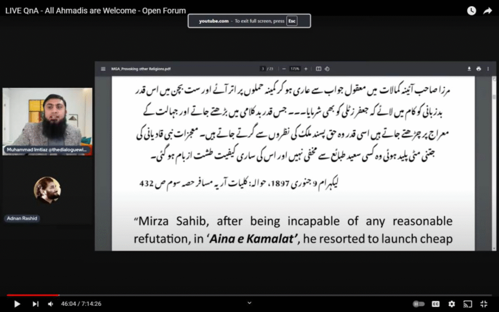 “Mirza is ready to carry the filth and dirt of the Christians and to rub his face on their shoes. He has given to the British Government the dignity of God. This donkey of an Antichrist has published such nonsense regarding His Majesty the Sultan that one has a strong desire that this Satan of impure mind… should be beaten with shoes 200 times… Curse on this offspring of a dog! He should have better become an open apostate to Christianity than use contemptuous words for the Sultan. I havemade five prophecies about him. (1) The Kadiani shall be involved in a serious case and shall be banished or chained and thrown into prison. (2) While in imprisonment he shall go mad. (3) He shall suffer from a fistula. (4) He shall become a leper and his figure shall be deformed. (5) His wife shall have unlawful connection with his disciples and after getting a divorce from him shall marry me. Maulawi Abu Sa‘id Muahmmad Husain will pronounce the marriage sermon. (6) Eventually the Mirza shall become blind, deaf and dumb and, committing suicide, shall be thrown into hell.”