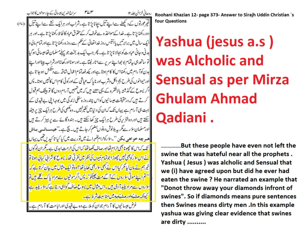 “Jesus was an Alcoholic and Gluttonous person, neither Abstinent nor a Pious Worshipper, nor a Truth seeker. He was a Proud and a Self- conceited Claimant of Divinity.” (Nur-ul-Quran, Roohani Khazain Vol 9 p.387).