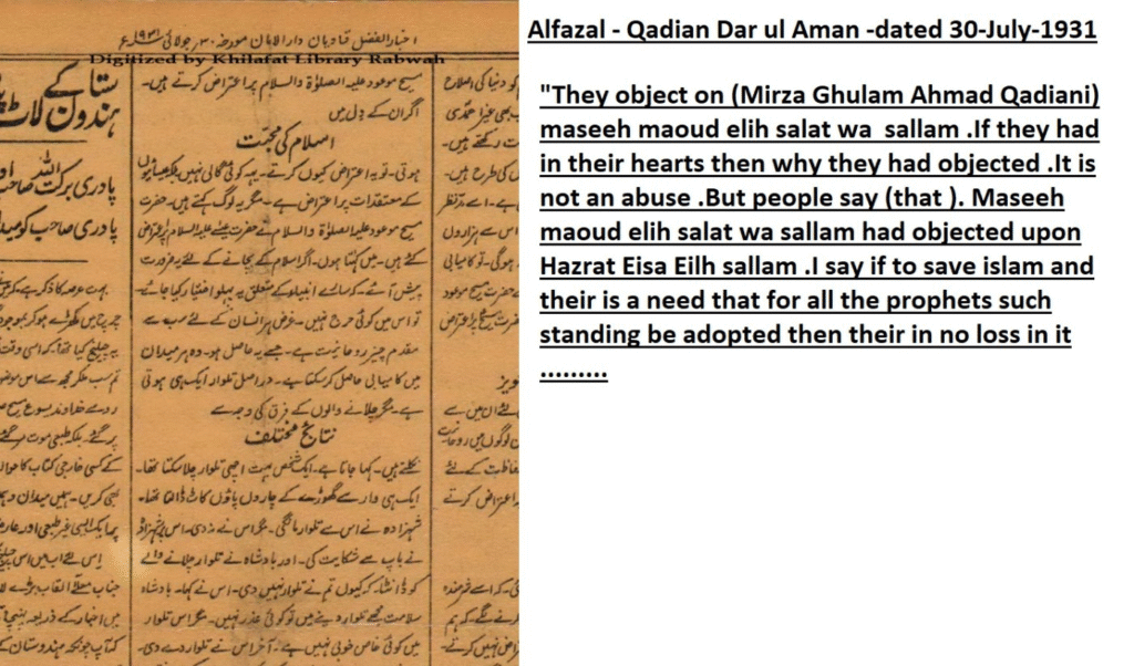 “”‘They object on (MGA) Maseeh-e-Maod..if they had in their hearts then why they had objected. It is not an abuse. But people say that. (MGA) Maseeh-e-Maod.. had objected upon Hazrat Eisa (as). I say if to save Islam and there is a need that for all the prophets such standing be adopted then there is no loss in it…””