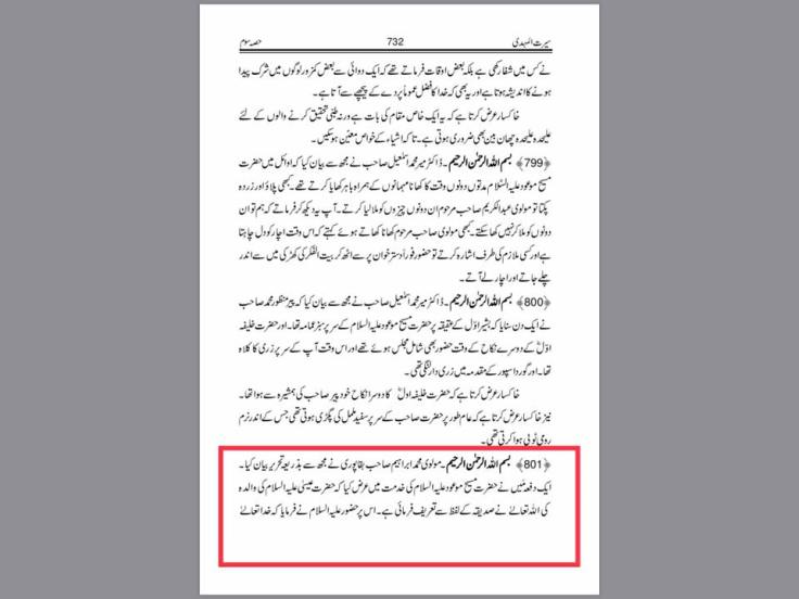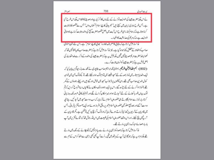 “(801) Molvi Muhammad Ibrahim Bakapuri stated to me in writing that once he said to hazrat Masih e Moud (Mirza) that Allah has praised the mother of Essa a.s. with the title of SIDDIQAH, but huzur (mirza) said that, here the word, siddiqah has been used for negating the divinity of Essa a.s.. It has been used just like we in our punjabi language use the phrase “BHARJAI KANIYE SALAM AKHNA WAN” meaning O you the one-eyed wife of my brother, I say Salam to you. So the actual purpose of this sort of salam is actually not to convey salam but to remind her that she is one-eyed.”