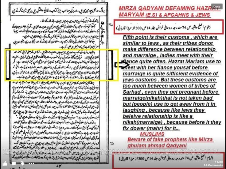 “that their (afghani) women meet and talk freely to their betrothed, some of their tribes (afghani) do not make distinction between being engaged and being in the Nikah. (mga is clever how he use the words, here he is saying that even if one is engaged they would carry on as a married couple) women meet their fiancé openly and talk freely. Hazrat Maryam Sadiqa to go out with her fiance Yousaf freely, is the firm testimony on this Israeli tradition. Women of certain coastal tribes (afghani) cross the boundaries with their fiances to the extent that they get pregnant before the Nikah, they do not get frowned upon, and they push aside the issue laughing and joking about it. Just like Jews, they, being betrothed see it a kind of nikah, during which the is set too.”