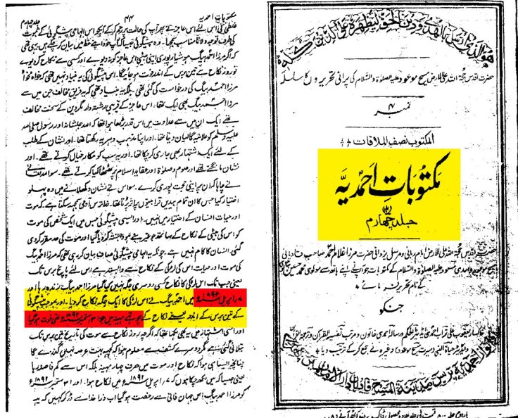 Ahmadiyya sources tell us that in roughly February of 1888, Mirza Ahmad Baig seems to have came to Qadian and asked MGA to make a deal. The issue was that Mirza Ahmad Baig’s sister (Imam Bibi) had been married to MGA’s cousin: Mirza Ghulam Hussain. Mirza Ghulam Hussain had went missing for roughly 25 years (1863 to 1888). He had lots of land in his and his wife’s possession, his wife possessed it for 25 years, however, per the rules of the Mirza family (Not Islam), if a person died with no children his land would revert to other family members.  However, this is unislamic, we are unsure where this tradition came from, however, the Mirza family was always playing this land-grabbing game. Mirza Ahmad Baig and his sister (Imam Bibi) knew that when Imam Bibi would die, the land would revert to MGA at 50% (+Mirza Sultan Ahmad) and 50% to his cousins (see Nuzul ul Masih, via the 2009 online edition of Tadhkirah, pages 190-191). MGA knew that Mirza Ahmad Baig was desperate for concessions.  MGA then asked for his daughter in exchange for signing over the property to Mirza Ahmad Baig’s sister.